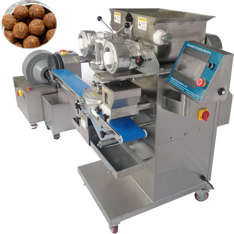 เครื่องทำลูกโปรตีนพลังงานอัตโนมัติราคาโรงงานเชิงพาณิชย์สำหรับทำทั้งลูกกลางและลูกไม่เติมมีถังพักสองอัน: ฮอปเปอร์ด้านซ้ายสำหรับปลอกแป้งและการอัดรีด ฮอปเปอร์ด้านขวาอีกอันสำหรับวัสดุเติมตรงกลางขนาดของลูกบอลสามารถเปลี่ยนได้ด้วยหัวฉีดแบบอัดรีด