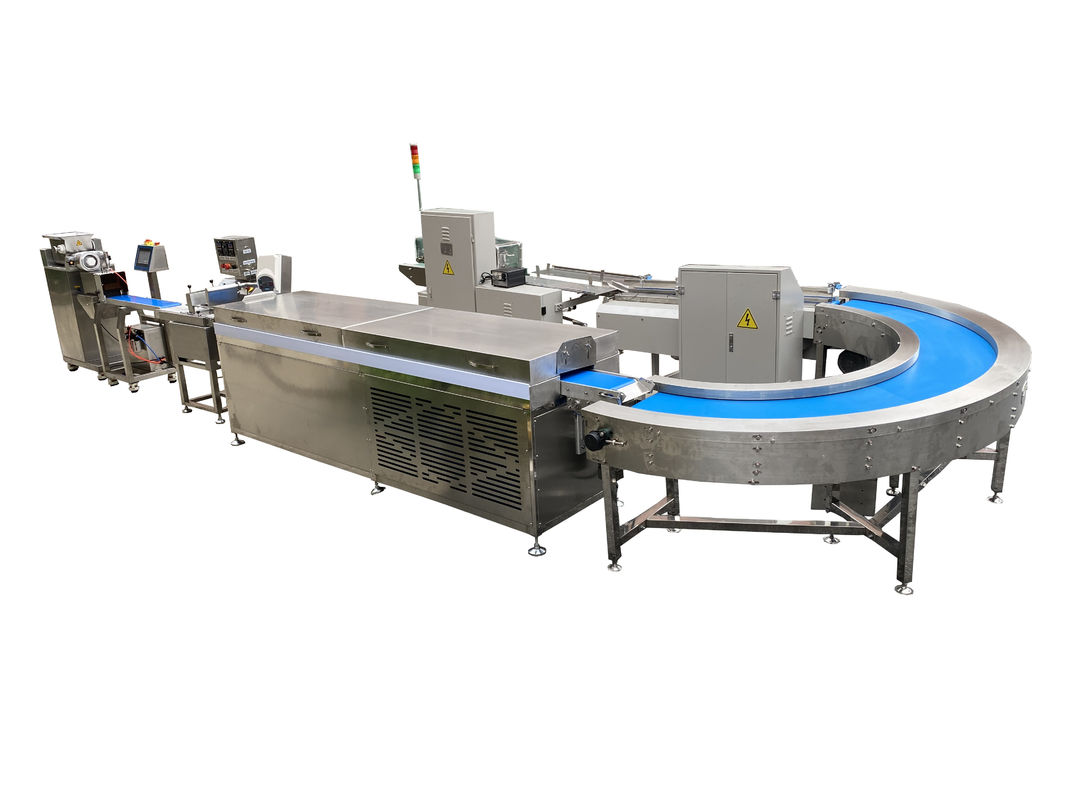สายการผลิตบาร์โปรตีน PAPA ประกอบด้วยเครื่องอัดรีดบาร์โปรตีนพร้อมเครื่องตัด, เครื่องเคลือบช็อกโกแลตขนาดเล็ก 8 กก., อุโมงค์ทำความเย็น 3.2 ม., เครื่องพลิก, สายพานลำเลียงเชื่อมต่ออัตโนมัติพร้อมเซ็นเซอร์ติดตามสามส่วน และเครื่องห่อฟิล์ม (ห่อด้านล่างฟิล์ม)